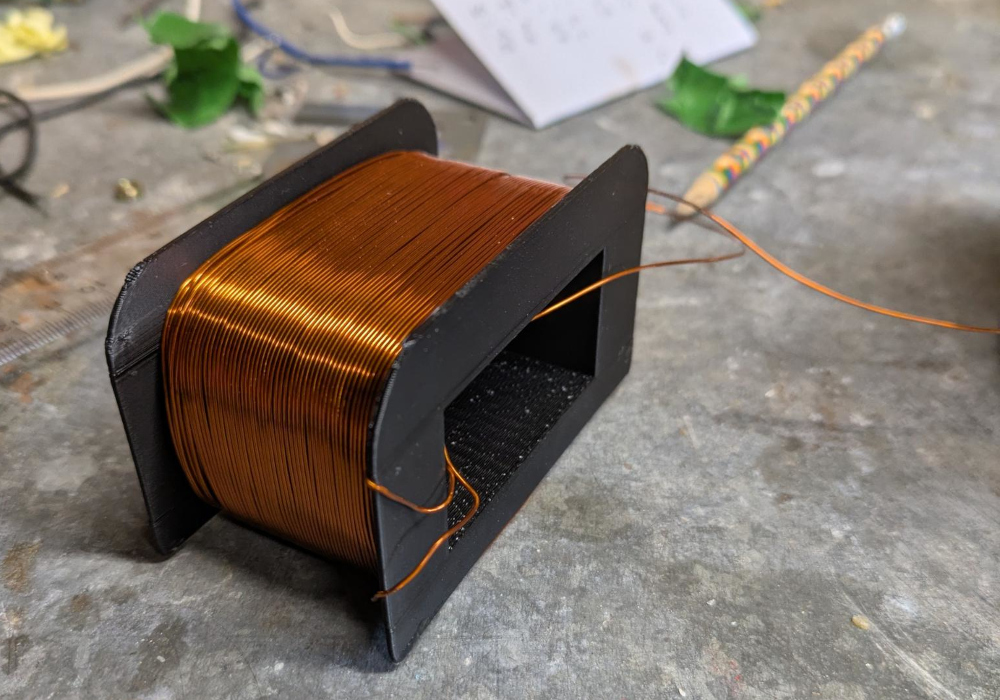 This shows that 148 turns needed to be used in the primary coil in order to keep the magnetic field in the core to below 1.9T and thus mostly out of saturation. The secondary used 372 turns which meant that the transformer had a winding ratio of ~1:2.5 and thus a theoretical output voltage of 425V. Once again a bobbin was 3D printed to house the windings, this time out of ABS in order to withstand potential high temperatures. A single winding was also added to the transformer to provide ~1.1V peak AC which could be used to trigger the thyristor.
