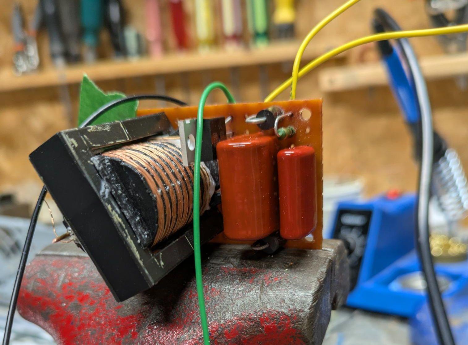 In order to charge the capacitor that would be discharged into the transformer, a single stage voltage multiplier circuit was made. The assembly would be powered using mains (120V AC), so the final capacitor would be charged to approximately 340 volts. This would allow for a theoretical output voltage of ~16kV. A thyristor was used to fire the circuit when needed.